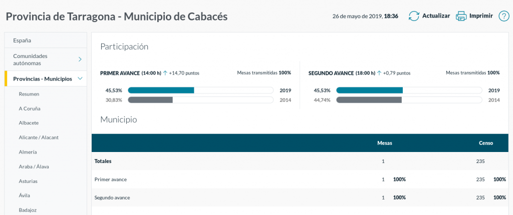 Cal destacar una petita incidència: la web oficial que recull les dades de participació ha comès un error, i a l’avançament de les 18h donava les mateixes dades per a les eleccions europees que a les 14h. Hem pogut comprovar, però, que a la tarda la participació era del 63,82%, més de 19 punts per sobre de la participació a la mateixa hora el 2014. La dada de participació a les eleccions municipals, en canvi, sí que s’havia actualitzat correctament.