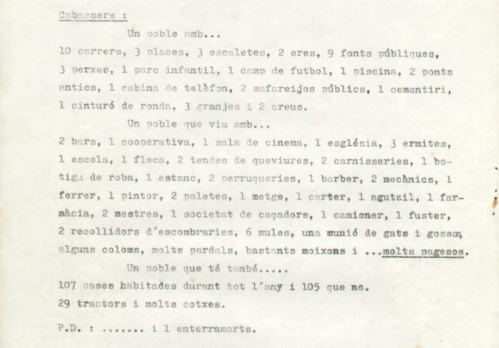 Trenta-sis anys després, Cabassers ha canviat molt. El nombre de carrers ha augmentat, les eres han desaparegut, al camp de futbol i a la piscina s’hi ha sumat una pista poliesportiva, la cabina de telèfon ja no hi és, i les granges han passat de 3 a 6.