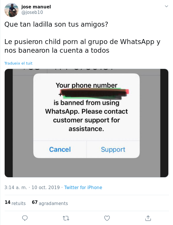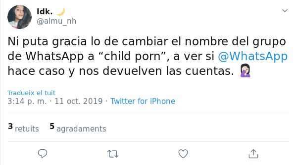 S’està estenent una broma de mal gust que ja ha fet que més de 250.000 usuaris s’hagin quedat sense poder utilitzar WhatsApp. La gracieta consisteix a canviar el nom de qualsevol grup pel de “Pornografia infantil” o “Child porn” en anglès. Així, l’aplicació de missatgeria instantània entén que s’estan infringint les seves normes d’ús i bloca a tots els usuaris que hi ha en aquell grup. I feina rai a recuperar el compte.