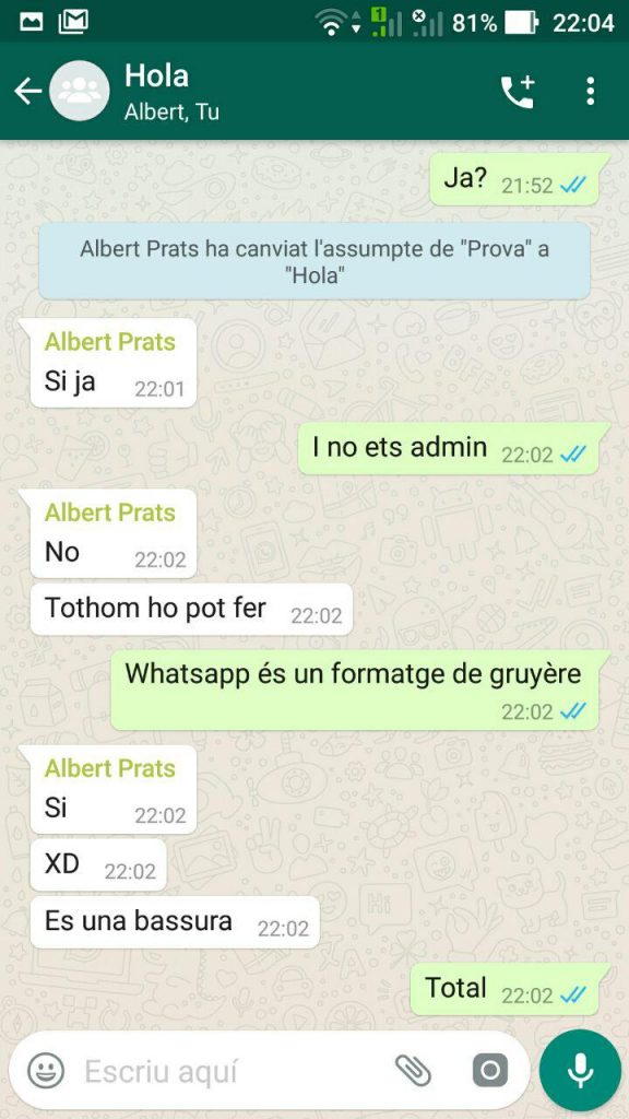 El cas és que el graciós que canvia el nom del grup també es queda sense poder utilitzar WhatsApp. Això passa perquè qualsevol usuari de qualsevol grup pot canviar-li el nom, encara que no en sigui administrador. Tot i les mancances, WhatsApp encara és l’aplicació de missatgeria instantània més popular. Hi ha una alternativa més segura, fiable, i amb més funcions: Telegram.