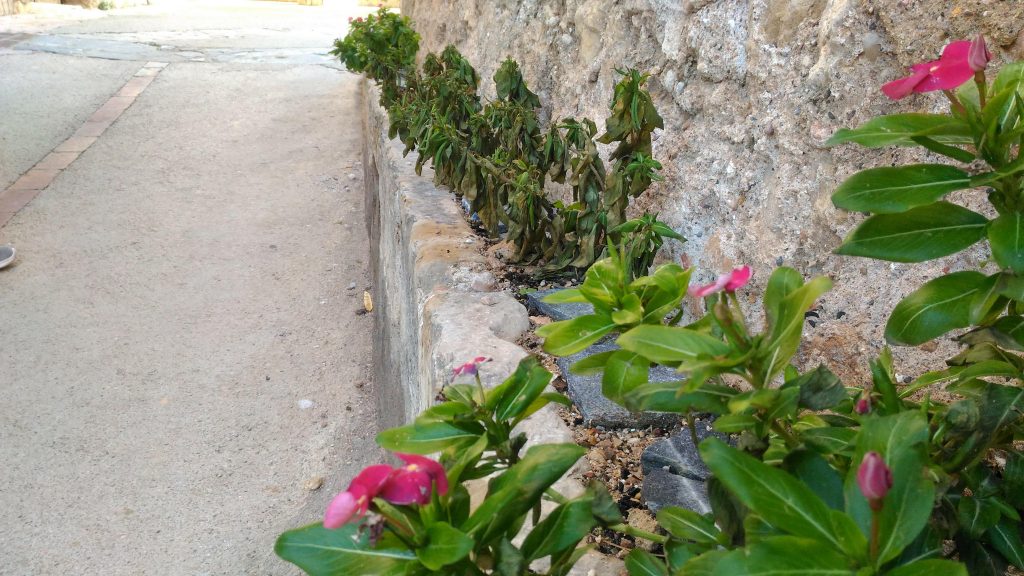 Tres plantes de l’antiga séquia del Tossal, reconvertida en jardinera pública, van aparèixer fa uns dies seques. Les fotografies que acompanyen aquesta notícia són anteriors a l’onada de fred, i per tant es pot descartar que la causa de la mort de les plantes siguin les temperatures.