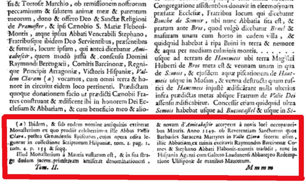 Aquell monestir va ser destruït pels moros, i la seva denominació primitiva es va perdre temps enrera entre les seves ruïnes, i la nova d’Amicabescir s’acceptà després de l’ocupació del lloc pels moros. L’any 1149, a causa del respecte pels sants que els bàrbars sarraïns en altres temps van fer màrtirs a Vallclara, per raó de les ruïnes, Ramon, compte de Barcelona, va construir allí l’abadia, i la donà a Esteve, abat de Montflabó, en aquell moment agent amb Gualter de Lió, com a abat per a l’alliberament de Lisboa de les mans dels moros.