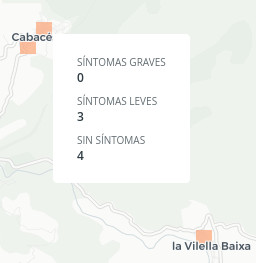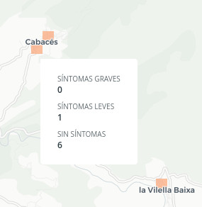 Si cliqueu a sobre de cada quadret, se us desplegarà la informació que li correspon. Així, el primer reporta 6 usuaris sense símptomes i 1 amb símptomes. El segon informa de 4 usuaris sense símptomes, i 3 amb símptomes. El total és la suma dels dos informes: 14 usuaris que han fet anar l’aplicació, i 4 que han reportat símptomes.