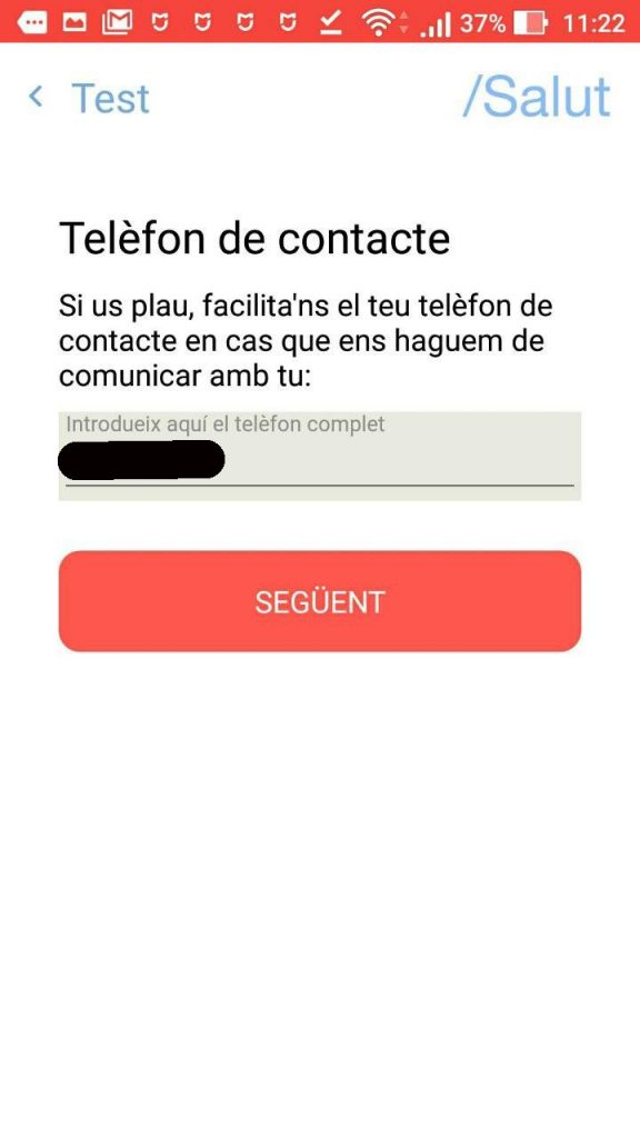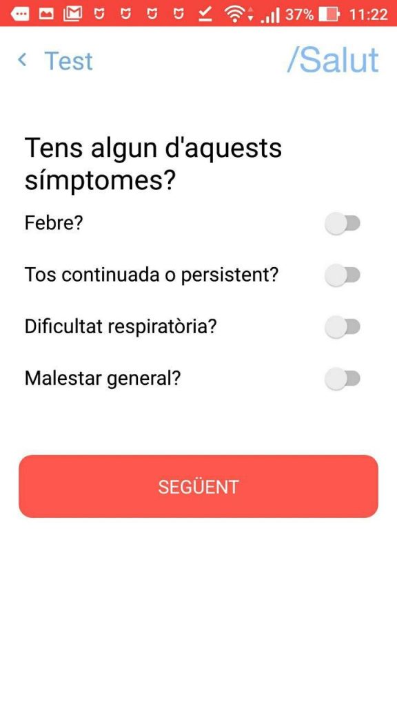 Quan hagueu acabat, premeu “SEGÜENT” i l’algorisme us donarà el resultat. Tingueu en compte que això no substitueix els tests de detecció de SARS-CoV-2 i que només és orientatiu. De totes maneres, si experimenteu símptomes greus (bàsicament, dificultats per a respirar), el Sistema d’Emergències Mèdiques actuarà per a ajudar-vos gràcies a la informació que li haureu proporcionat amb l’aplicació.