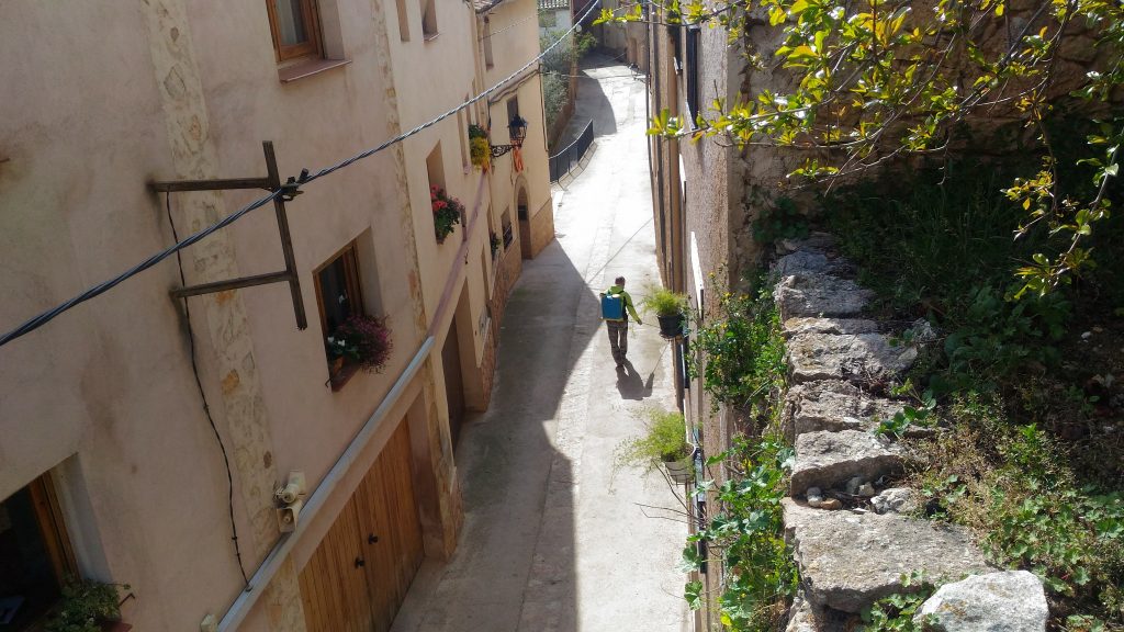 Per la seva banda, l’Ajuntament també descontamina els carrers menys transitats del poble, com es pot veure a aquesta fotografia presa la tarda d’ahir, 6 d’abril: