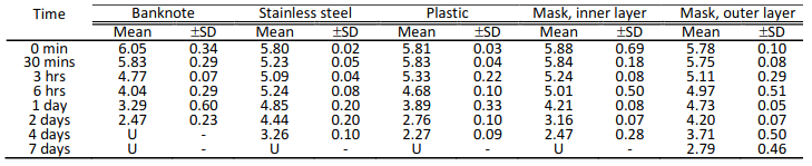 Superfícies: sobre el paper, ja no es detecta rastre del virus passades 3 hores de la seva contaminació. Igualment sobre el paper de teixit. Sobre la fusta, es desintegra als 2 dies, igual que sobre la roba. Sobre el vidre desaprareix als 4 dies, i tarda el mateix temps a desaparèixer sobre un bitllet. Als set dies ja no en queda rastre sobre l’acer inoxidable, el plàstic i la part interior de les mascaretes. En canvi, passada una setmana, encara es troba amb capacitat infectiva sobre la part exterior d’una mascareta.
