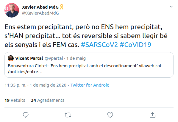 El viròleg de l’IRTA Xavier Abad també avisava l’1 de maig sobre la precipitació de les mesures preses pel govern espanyol per a relaxar el confinament: