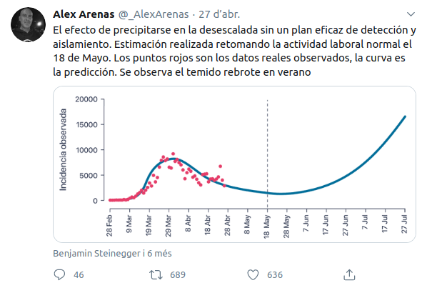 El físic de la Universitat Rovira i Virgili Alex Arenas advertia via Twitter el 27 d’abril del perill de fer malament la desescalada: