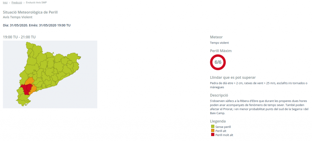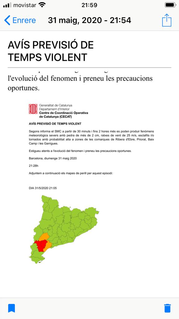 El vespre es pot complicar molt. El Centre de Coordinació Operativa de Catalunya ha emès una alerta per temps violent, segons la previsió del Servei Català de Meteorologia, que alerta de la possibilitat de fenòmens extrems fins a les dotze de la nit. Els meteors poden incloure pedra de més de 2cm de diàmetre, ratxes de vent superiors a 25m/s, i esclafits o tornados. Tot això, amb probabilitat alta a zones de les comarques del Priorat, la Ribera d’Ebre, la Terra Alta i les Garrigues.
