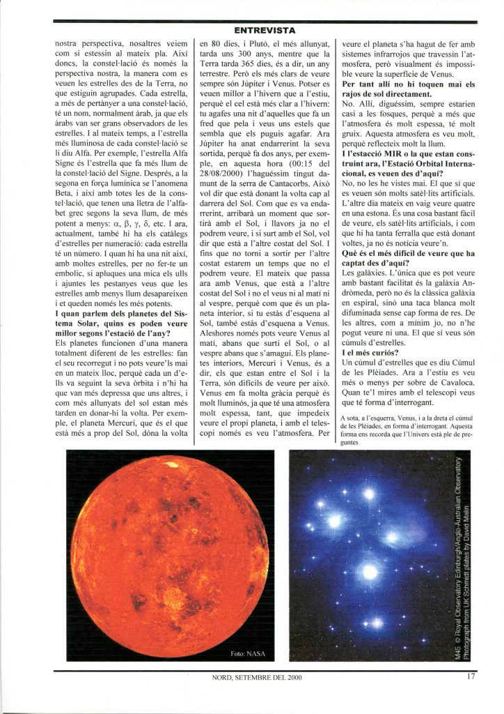 Després de veure què era capaç de mostrar el seu telescopi, d’observar els cràters de la Lluna, de mirar Júpiter i algunes estrelles, vam engegar l’enregistradora de veu i vam començar a fer l’entrevista. I en un moment donat, parlant de Júpiter, ens va dir que “ha anat endarrerint la seva sortida, perquè fa dos anys, per exemple, en aquesta hora l’haguéssim tingut damunt de la serra de Cantacorbs”. Mentre gravàvem la conversa, vam apuntar la data i l’hora, perquè l’entrevista no sortiria publicada fins al setembre, i era obvi que calia contextualitzar de quin moment es parlava. Per això al text publicat hi vam afegir “00:15 del 28/08/2000”, entre parèntesi, després que en Joaquim digués “en aquesta hora”.