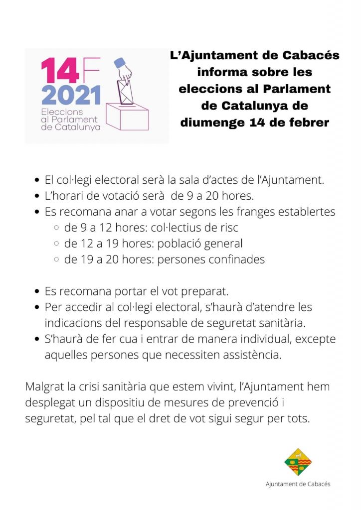 Tot i les circumstàncies excepcionals a causa de la pandèmia, demà se celebraran eleccions al Parlament de Catalunya. L’Ajuntament ha publicat unes recomanacions per tal de garantir la seguretat d’electors i membres de la mesa: