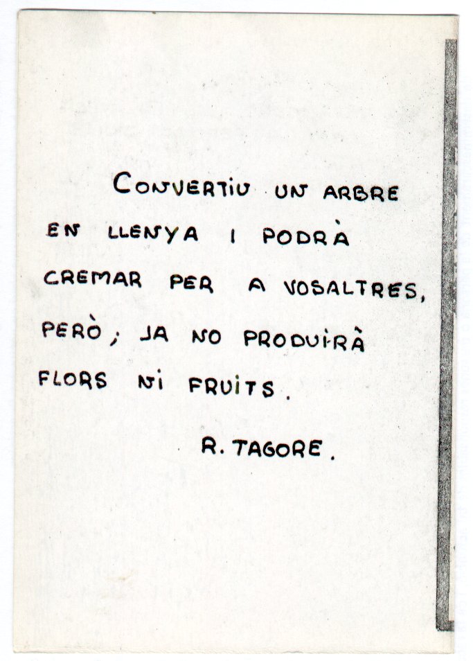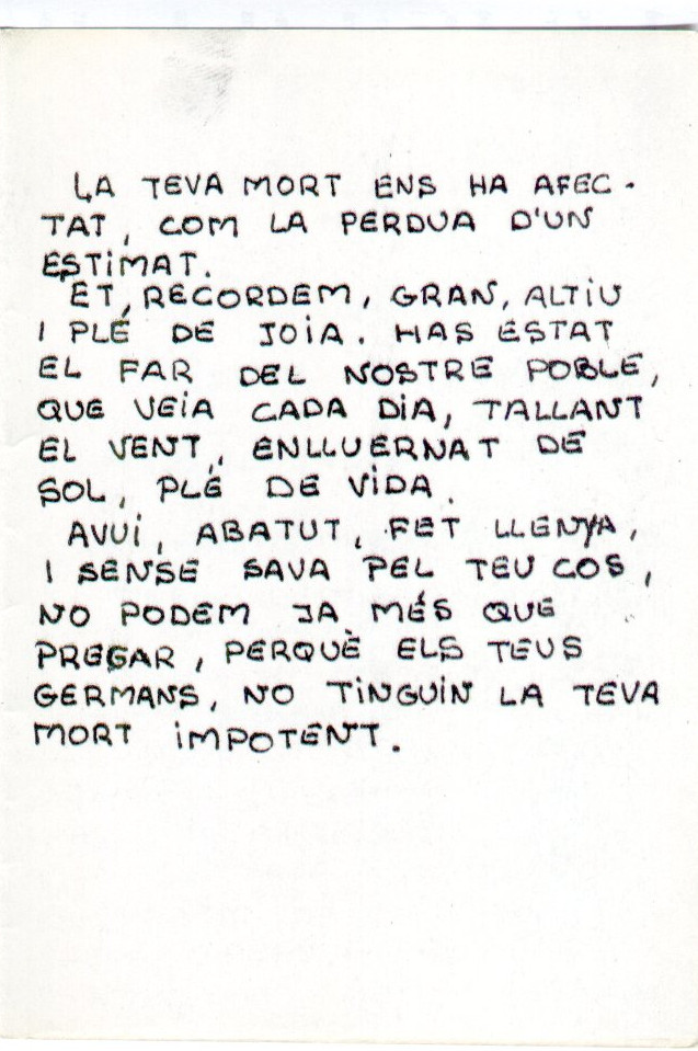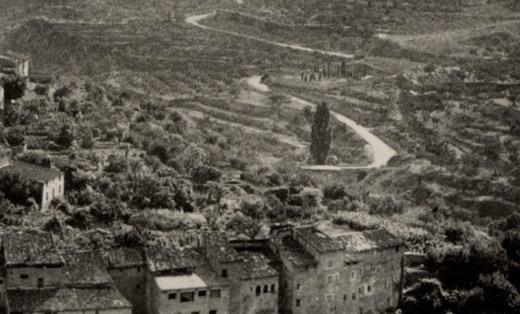 Una postal amb una panoràmica de Cabassers, vist des del Calvari, mostra el xop centenari que hi havia al barranc de Montsant, just després del pont de la carretera de la Bisbal. La targeta no és de les més comunes amb vistes del poble. No consta qui en fou l’editor, i al dors només s’hi pot llegir “Cabacés – Tarragona. Vista del Pueblo”. Va ser circulada el 18 d’agost del 1972 cap a Barcelona, i per tant la imatge deu ser d’aquell any, o de pocs abans.