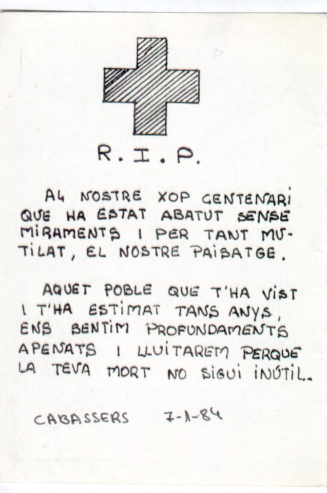 Es dóna la circumstància que aquest xop, que era considerat icònic, es va tallar el gener del 1984, potser perquè suposava algun risc per als vehicles que circulaven pel pont proper. El cas és que la seva desaparició va generar protestes, fins al punt que la revista El Sitjar, que s’edità a Cabassers entre el 1983 i el 1986, va arribar a distribuir una esquela commemorativa de l’arbre: