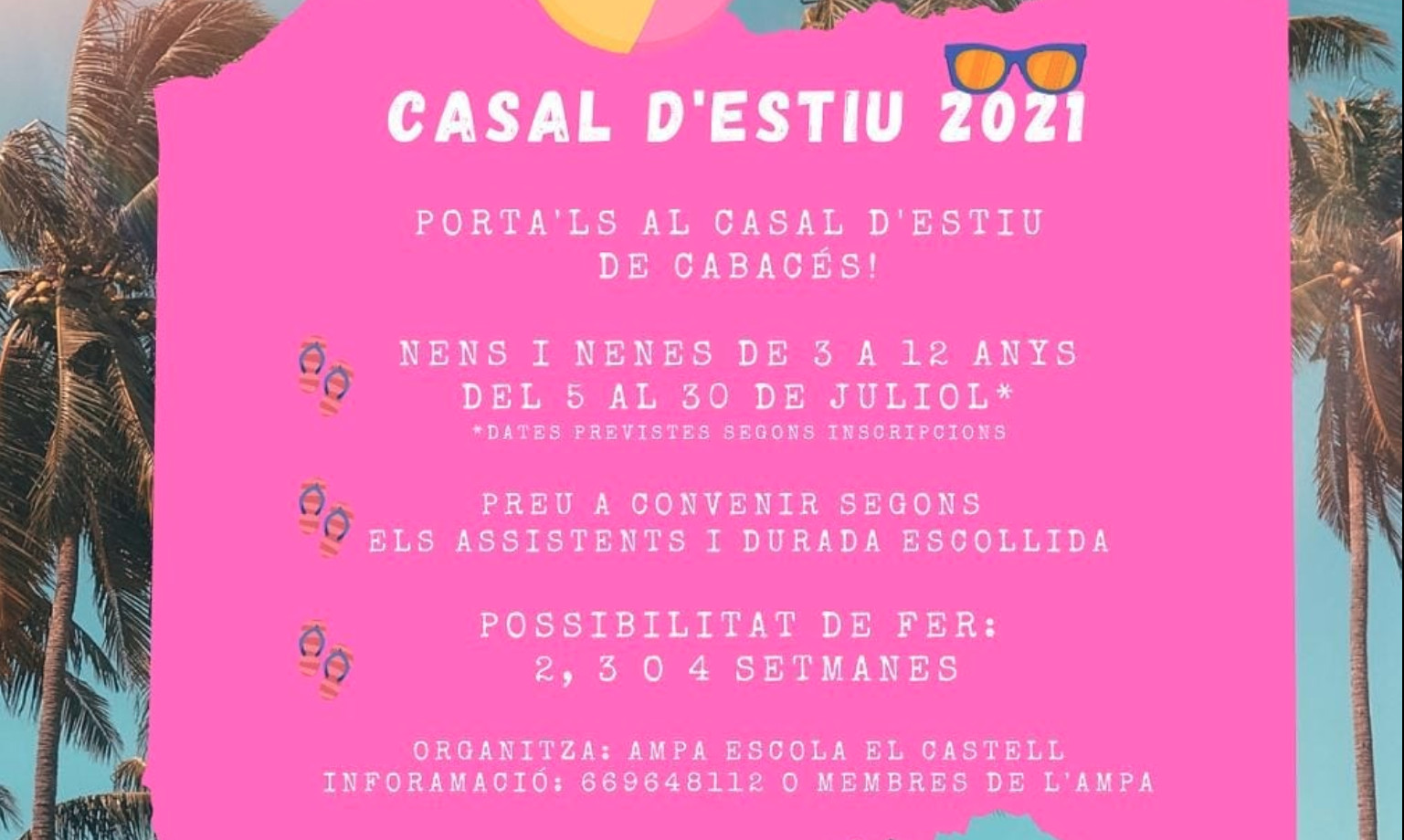 Del 5 al 30 de juliol estarà en funcionament el Casal d’Estiu de Cabassers, per a canalla d’entre 3 i 12 anys. Hi haurà la possibilitat que els infants puguin fer estades al casal de 2, 3 o 4 setmanes. El preu és variable, depenent del nombre de participants i de la durada de l’estada que es prefereixi. Si teniu interès en apuntar els vostres menuts al casal, poseu-vos en contacte amb els membres de l’AMPA.