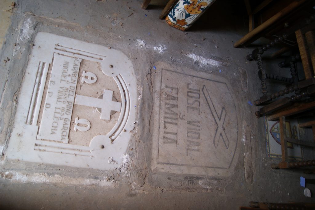 Hi ha també, al centre de la capella, la tomba que conté les restes de l’últim propietari habitant del mas, Miquel Vidal i Llecha, que morí el febrer de 1968. La mateixa sepultura també conté els cossos de la seva esposa i del seu pare: