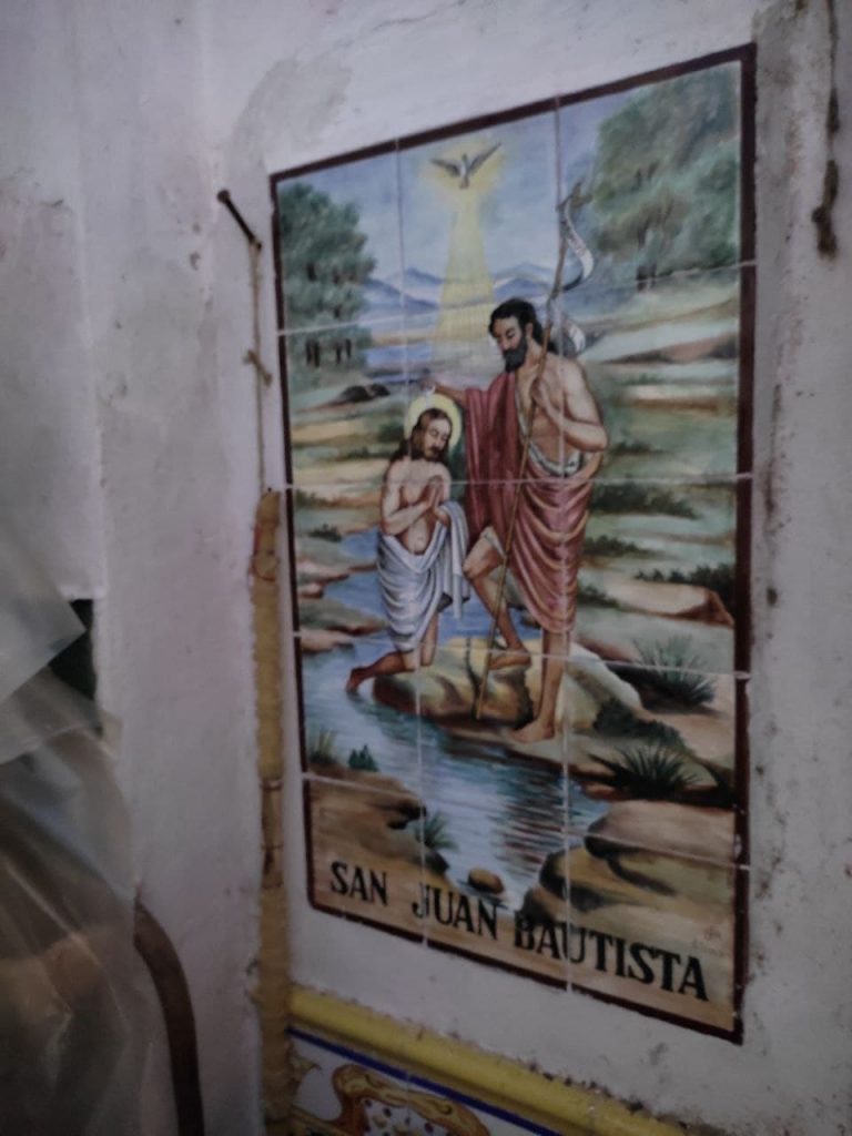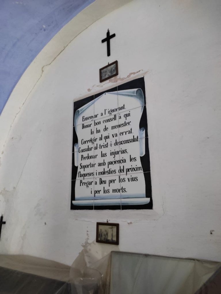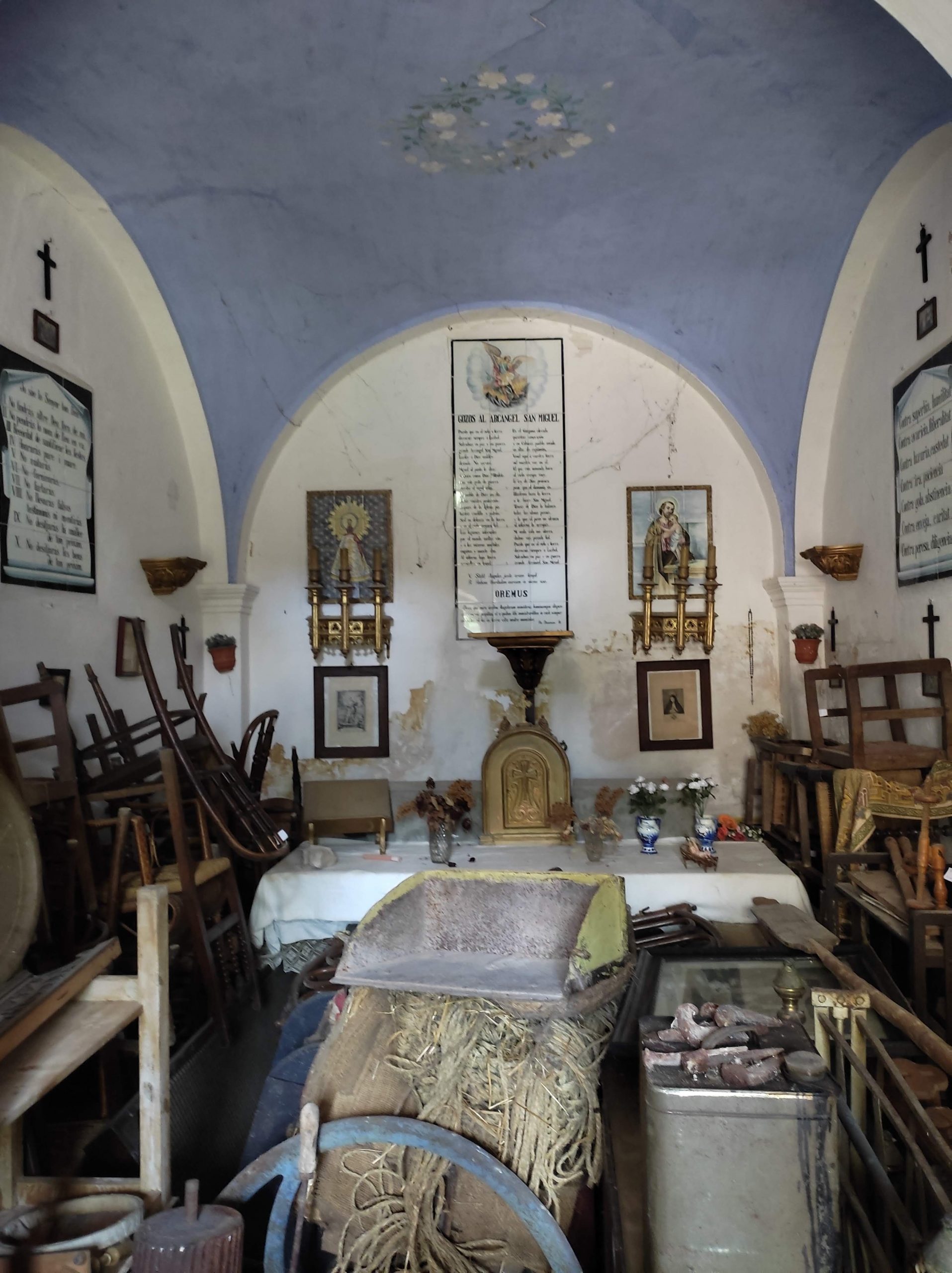 La decoració de l’interior segueix el mateix estil que l’exterior, amb molta ceràmica pintada. També hi ha imatges i textos religiosos emmarcats, que pengen de les parets, i uns goigs a Sant Miquel, igualment en ceràmica.