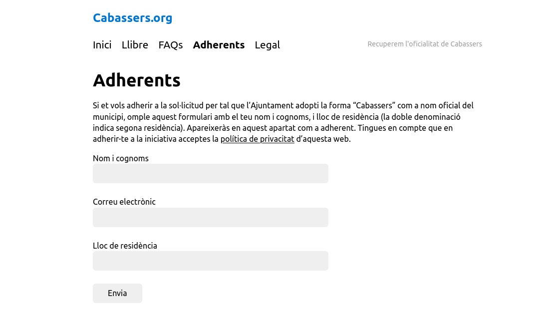La campanya de cabassers.org, que sol·licita a l’Ajuntament que es corregeixin les faltes ortogràfiques que hi ha a la forma oficial del nom la població, i que s’oficialitzi la forma normativa de “Cabassers”, ja recull trenta suports en poc més d’una setmana. Com més temps passa, més gent s’adona de la necessitat de fer les coses bé, i de tenir com a denominació oficial de la població la forma correcta del topònim.
