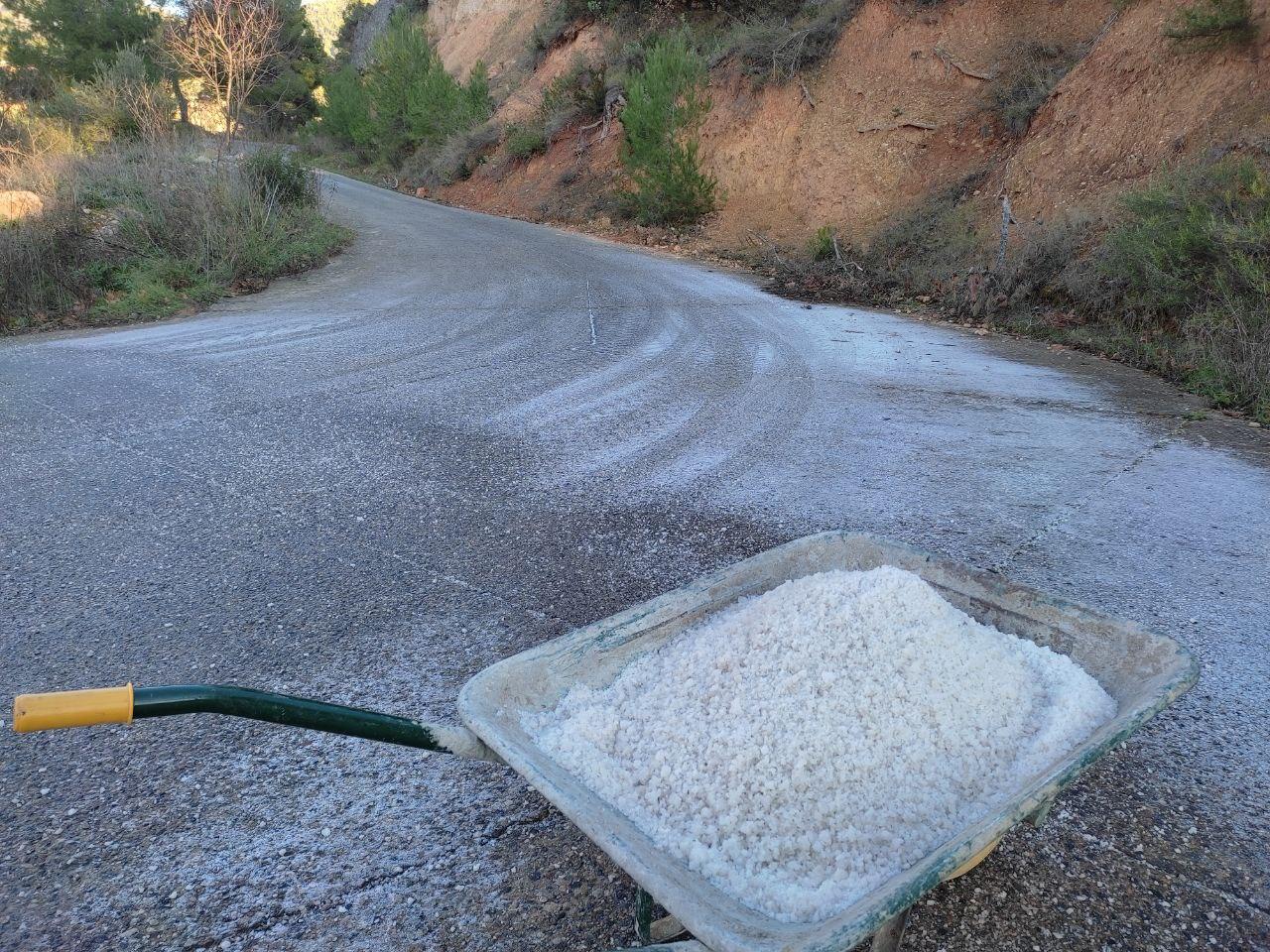L’Ajuntament ha escampat sal a les zones més ombrívoles de les vies on s’acumula gel durant tot el dia, cosa que suposava un perill per a la circulació, tant de vehicles com de persones. Un d’aquests racons és la cruïlla del Camí Nou amb el camí de la Cova de la Guineu i la carretera T-702, que d’ençà que les temperatures són tan baixes acumula gel les 24 hores.