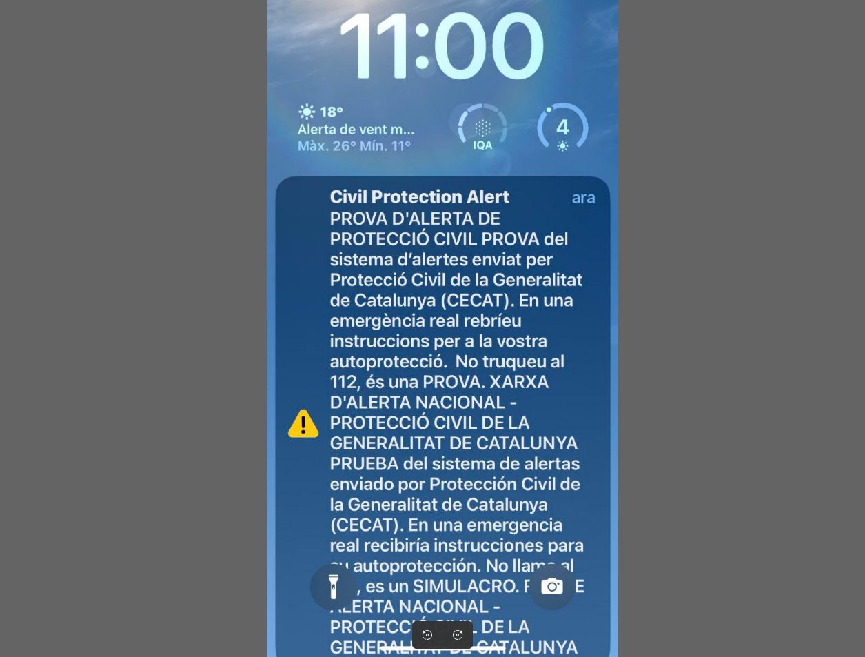 PPROVA D’ALERTA DE PROTECCIÓ CIVIL. PROVA del sistema d’alertes enviat per Protecció Civil de la Generalitat de Catalunya (CECAT). En una emergència real rebreu instruccions per a la vostra autoprotecció. No truqueu al 112, és una PROVA. XARXA D’ALERTA NACIONAL – PROTECCIÓ CIVIL DE LA GENERALITAT DE CATALUNYA.