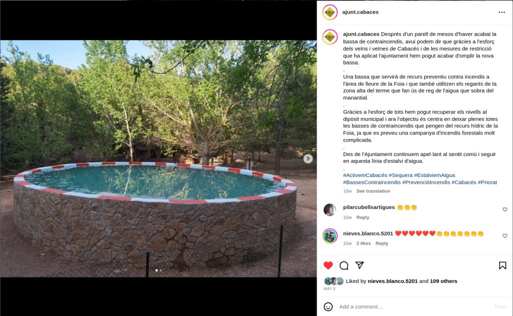 El 8 de maig l’Ajuntament anunciava al seu canal a Instagram que s’havia pogut omplir la bassa contra incendis de la Foia “gràcies a l’esforç dels veïns i veïnes” i de “les mesures de restricció que ha aplicat l’ajuntament”. Afegia que la bassa “servirà de recurs preventiu contra incendis” i que “també l’utilitzen els regants de la zona alta del terme quan fan ús de reg de l’aigua que sobra del manantial”. Acabaven dient que l’objectiu era “deixar plenes totes les basses de contraincendis que pengen del recurs hídric de la Foia, ja que es preveu una campanya d’incendis forestals molt complicada”. Aquesta és la publicació a Instagram on l’Ajuntament difonia la notícia de l’ompliment de la bassa: