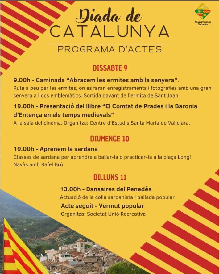 Els actes entorn la Diada Nacional de Catalunya començaran el 9 de setembre. A les 9 hi haurà una caminada per a fer una ruta a peu per les ermites de Sant Joan, Sant Roc i la Foia. Es desplegarà una gran senyera davant d’aquests edificis i s’hi faran enregistraments i fotografies.