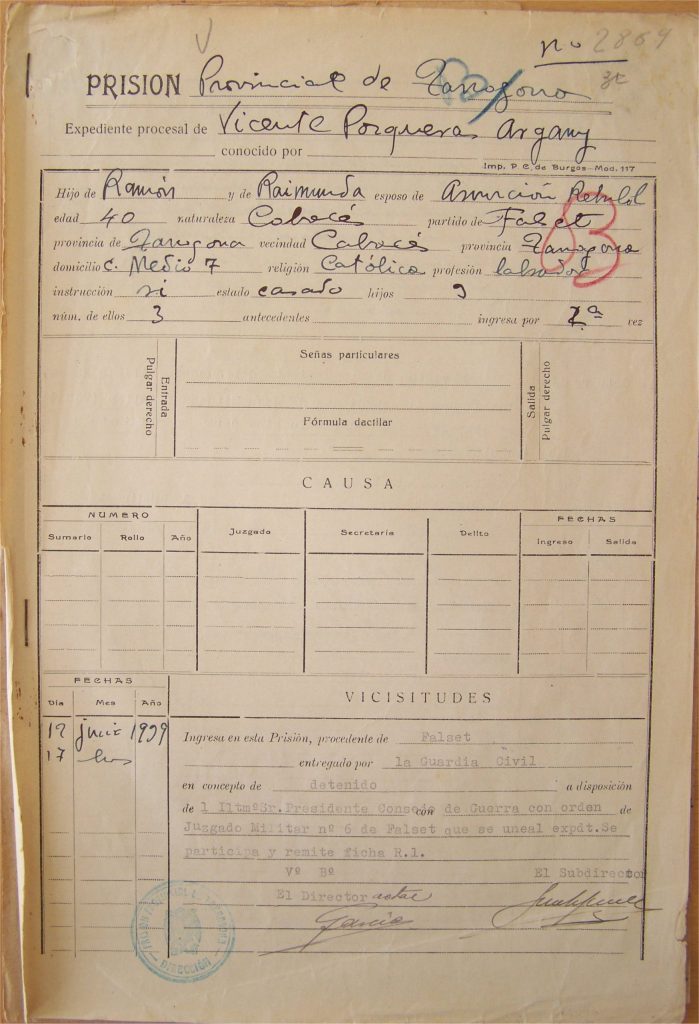 Vicent Porqueres Argany va ser alcalde de Cabassers per Esquerra Republicana de Catalunya de l’agost de 1936 fins que fou mobilitzat per anar al front. Havia participat ja als fets d’octubre de 1934 com a president del Comitè Revolucionari que proclamà l’Estat Català a Cabassers. Per aquell motiu ell i tots els altres membres del Comitè Revolucionari cabasserol foren empresonats el mateix octubre de 1934 al vaixell Manuel Arnús, habilitat com a presó al port de Tarragona. Fou jutjat per un consell de guerra el novembre de 1935 i condemnat a un any de presó, però alliberat per haver ja complert la pena durant la presó preventiva (més temps del que el condemnava la sentència).