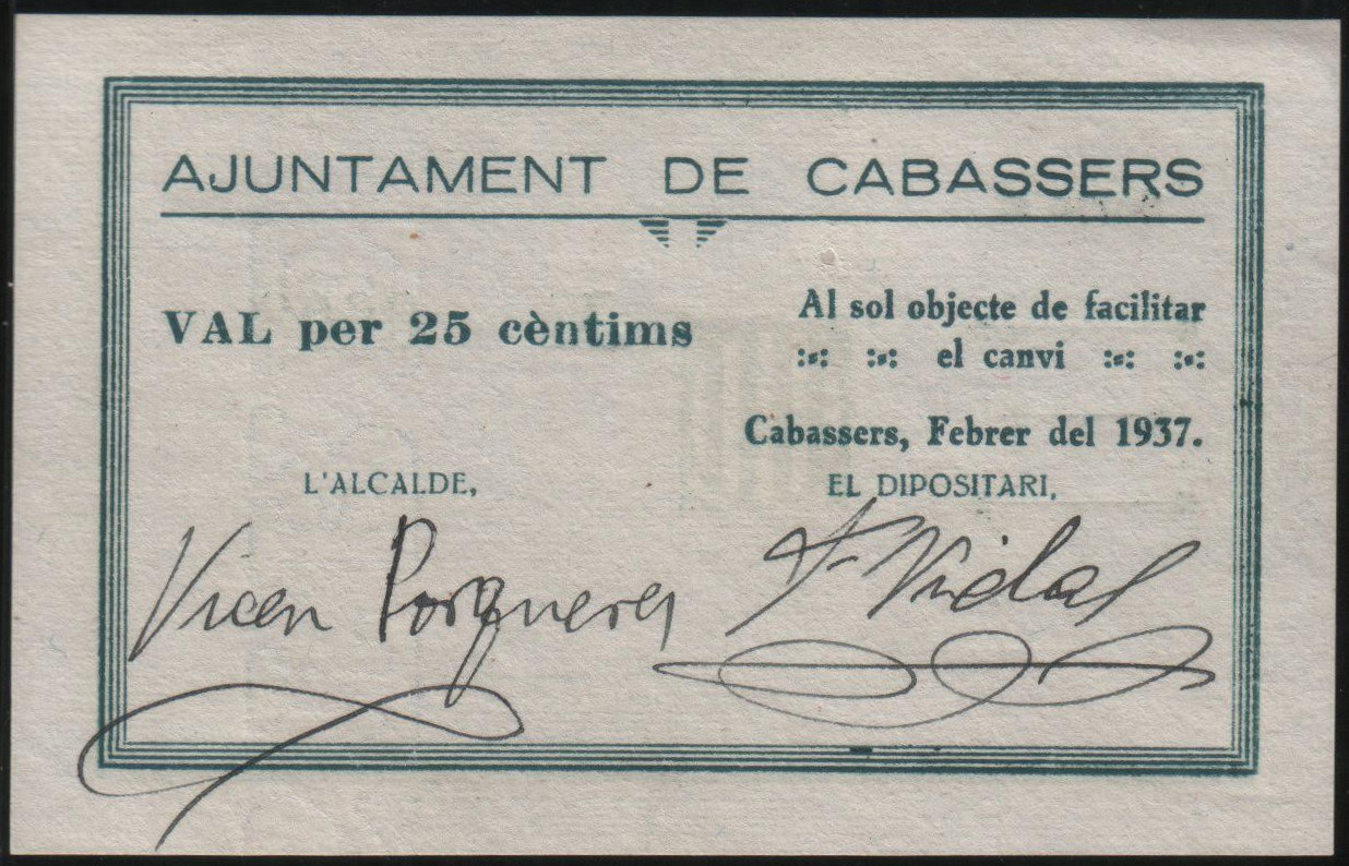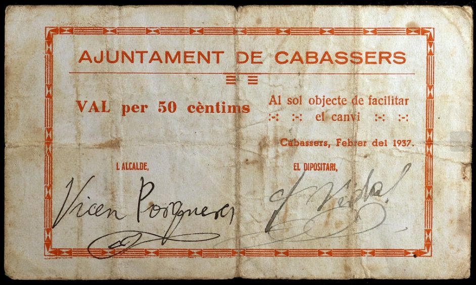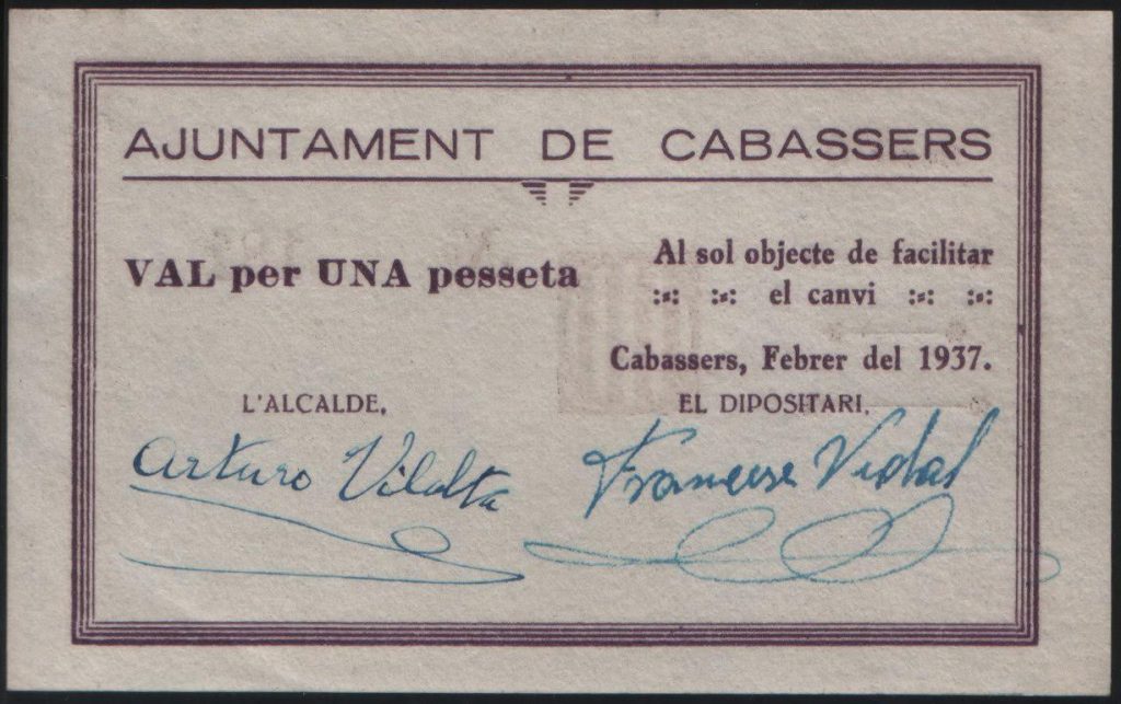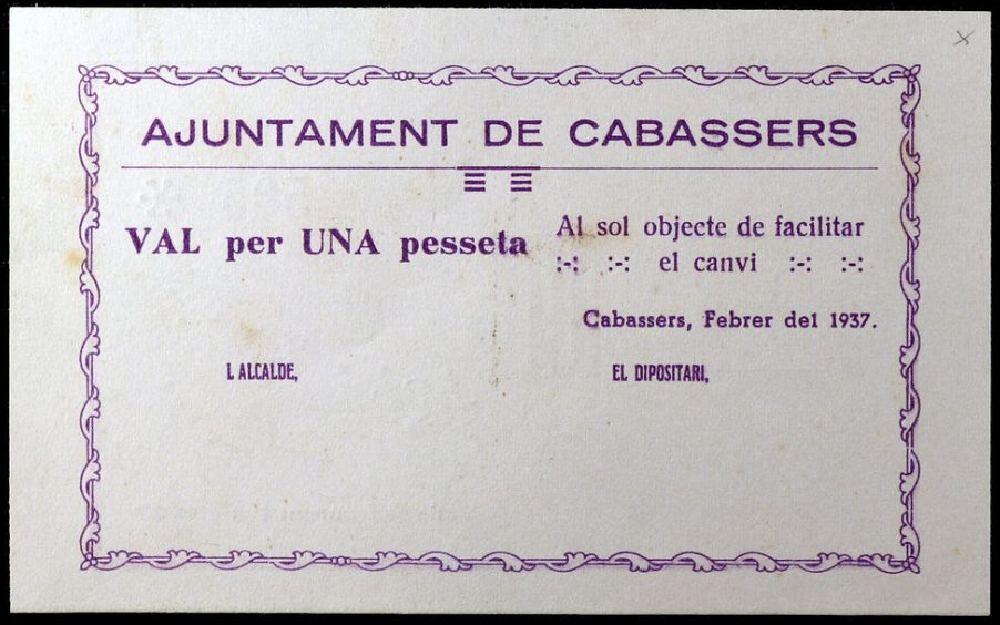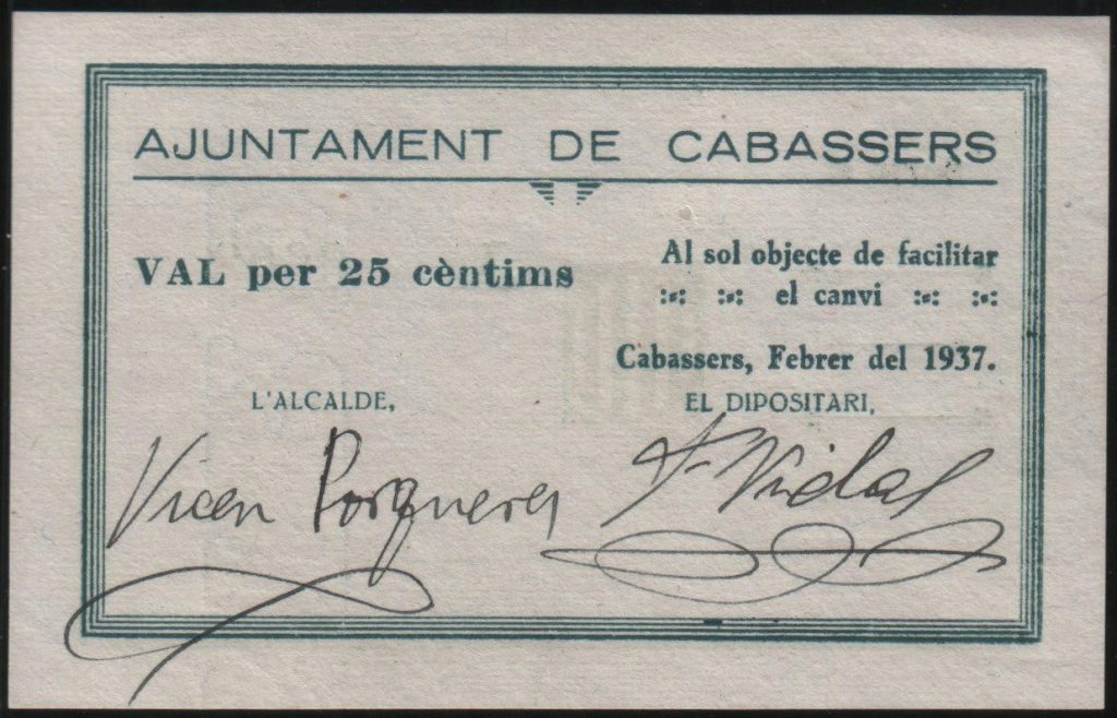 El 18/09/2020 publicàvem un article sobre les emissions de moneda local fraccionària que l’Ajuntament de Cabassers va fer durant la guerra d’Espanya. Es van emetre tres valors diferents en cinc sèries: