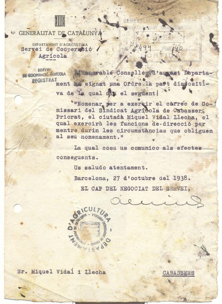 A partir de 1939 el franquisme desmembraria aquesta organització pagesa, convertint el Sindicat Agrícola de Cabassers en la “Unión Agrícola de Cabacés”, i l’edifici d’aquell sindicat del 1933 (incloent el cafè) passà a mans de la Falange Española Tradicionalista y de las JONS per haver estat declat organizació marxista. Durant aquesta època s’arribà a censurar amb pintura negra la inscripció en relleu feta pel Sindicat Agrícola a la façana principal de l’edifici el 1933 en acabar l’obra, l’octubre d’aquell any.